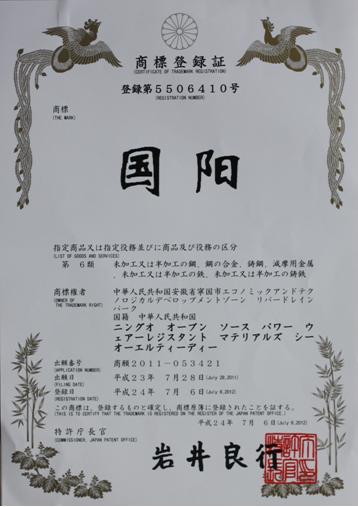 2012年7月, 公司“國(guó)陽(yáng)”商標(biāo)分別在韓國(guó)、日本注冊(cè)成功。