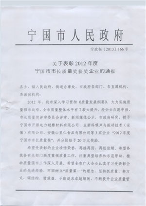 寧國市市長質(zhì)量獎是市政府設(shè)立的最高質(zhì)量榮譽(yù),主要授予本市具有法人資格、實施卓越的質(zhì)量管理經(jīng)營模式、有廣泛的社會知名度與影響力、在行業(yè)內(nèi)處于領(lǐng)先地位、取得顯著經(jīng)濟(jì)效益或社會效益的企業(yè)。2008年以來,公司通過導(dǎo)入、推進(jìn)卓越績效管理模式,積極創(chuàng)新質(zhì)量管理理念和方法,在公司內(nèi)部營造了深厚的學(xué)習(xí)和應(yīng)用氛圍。在接到市質(zhì)監(jiān)局關(guān)于 2012年度 “市長質(zhì)量獎”的參評通知后,公司即刻系統(tǒng)地梳理了2009年至2012年經(jīng)營管理工作,從領(lǐng)導(dǎo)、戰(zhàn)略、顧客與市場、資源、過程管理、測量、分析和改進(jìn)、經(jīng)營結(jié)果等七個方面進(jìn)行了自我評價。評審分為文件審核和現(xiàn)場審核兩部分,公司以文審第一名的成績進(jìn)入現(xiàn)場評審階段并于2012年7月25日通過了專家的現(xiàn)場評審。經(jīng)公示后,公司最后榮獲2012年市長質(zhì)量獎。